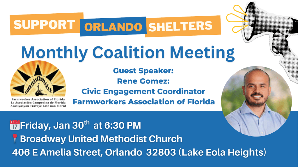 Join the Support Orlando Shelters Coalition meeting on Friday, Jan 30 at 6:30 PM featuring guest speaker Rene Gomez from the Farmworkers Association of Florida, with training on public comment and community advocacy. Please bring non-perishable food items to donate to the Farmworkers Association pantry as we stand together for housing, dignity, and mutual aid.