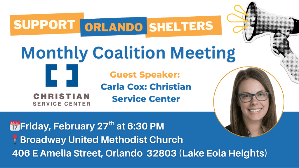 Join the Support Orlando Shelters Coalition meeting on Friday, Jan 30 at 6:30 PM featuring guest speaker Carla Cox from the Christian Service Center