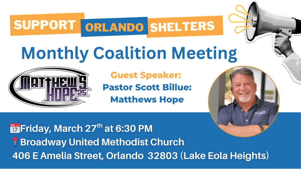 Join the Support Orlando Shelters Coalition meeting featuring guest speaker Pastor Scott Billue, founder of Matthew’s Hope Ministries.