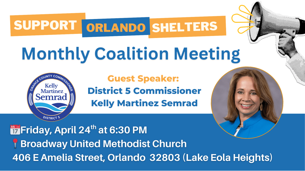 Join the Support Orlando Shelters Coalition meeting featuring guest speaker Commissioner Kelly Martinez Semrad of District 5.